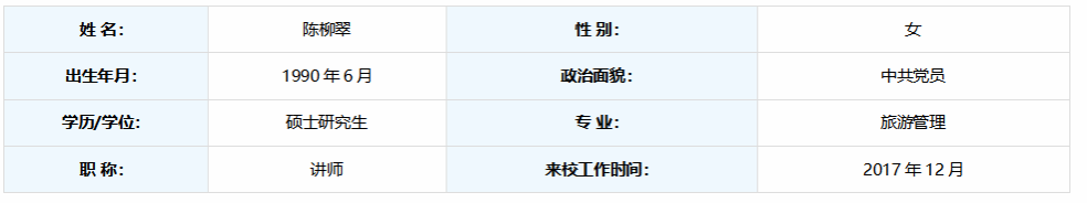 陈柳翠同志自2017年12月来校工作以来,主要从事旅游管理等相关课程教学,具备相应的教学能力与专业素养,符合教研室主任选聘条件。